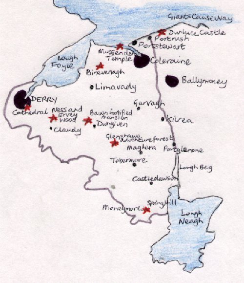 Also known as Magilligan Strand this long sandy beach, 10km (6miles) is Ireland's longest and has earned a Blue flag for cleanliness. At Magilligan Point there is a Martello tower built in the times of the Napoleonic Wars to guard the entrance to Lough Foyle. Coleraine Coleraine is a University town also with a large hospital. the fastest motorcycle race in the world is run between Portstewart , Coleraine and Portrush, during May each year, and is known as the NorthWest 200. Londonderry Londonderry was founded by Saint Columba in 546 AD. He founded a monastery beside the River Foyle, he called the place Doire, meaning "oak grove", later changed to Derry in English. The "London " prefix was acquired in 1613 when the city was selected by the London livery companies as a base of major Plantation. Most people still call it Derry though. St. Columb's Cathedral The cathedral was built in "Planters' Gothic" style. It was the first cathedral to be founded after the Reformation in the British Isles, and was built between 1628 and 1633. The inside was rebuilt in the 19th century. There is a small museum in the Chapter House, which has examples of the locks and keys of the city. There is also a cannonball fired into the city by the troops of James II, with instructions how to surrender hidden in its centre. The reply of the Protestants was "No surrender", a phrase still used by the Loyalists to this day. The Diamond The square in the centre of the city is known as the Diamond. There is a war memorial which was originally meant for the city of Sheffield in England. It was erected in 1927. Earhart Centre Near Derry in 1932 Amelia Earhart landed her small plane ending her record breaking first woman to compleat a transatlantic flight alone. She had intended to fly to Paris, France but ended up landing outside Derry. A sculpture to this American record breaker records the spot, while near Muff there is a centre about her life and achievements. Guildhall The Guildhall was originally built in 1890 but it has suffered a fire in 1908 and a bomb in 1972 which mean that it has been restored recently. There are stained glass windows which tell the history of derry, they are copies of the originals which were lost in the damage the hall sustained. Behind the Guildhall is Derry Quay from where in the 18th and 19th centuries Irish Immigrants sailed to America. Tower Museum O'Doherty Tower where this museum is housed is a replica of the tower that once stood on this site in the 16th century. It houses information and exhibits on the history of the city, and treasures from the Spanish Armada ships that were wrecked off the coast near by. Walls of Derry The walls of Derry are among some of the best preserved city walls in Europe. They rise to 8m (26ft) high, and at places are 9m (30ft) deep. They were finished in 1618 to protect the city from the Gaelic Chieftains in Donegal. the walls were never breached even in a siege in 1689 when out of a population of 20,000 7,000 died from starvation and disease. Just outside the old walls is the butcher's Gate, a famous landmark of the Bogside, a catholic area. Mussenden Temple The temple was built in 1785 by frederick Augustus Hervey, the Protestant Bishop of Derry and Earl of Bristol as a memorial to his cousin Mrs Frideswide Mussenden. It was based on the Temple of Vesta near rome, and is made of basalt and sandstone. It is perched on a headland outside the family resort of Castlerock. It housed a library and it is said a bedroom for the bishop's mistress, the property is now cared for by the National Trust. Items from the bishop's former residence Downhill Castle, which was burned down are now housed in the temple. Portrush Situated on Ramore Head is Portrush. Here is the world famous Royal Portrush Golf Links, and you can walk along the beach to white rocks, where there are arches and caves carved into the limestone by the waves and wind. Portstewart This was a popular victorian seaside town. There is a seafront Promanade, and west of the town is Portstewart Strand a beautiful long sandy beach protected by the National trust. |