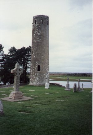 Clonmacnoise, Cluain Mhic Nóis, The Pastures of the descendents of Moas. Situated on the River shannon it is one of Irelands most important and interesting monastic settlements. St. Ciaran founded a monastry here in 548 and it was so succesful that the vikings burned it no less than 26 times between 844 and 1012. Rory O'Connor, Irelands last high king was buried here in 1198. The cathedral built in the 15th century and restored in 1689, has a fine door with the figures of Saint Francis, Saint Patrick and Saint Dominic. King Flann's Cross, or the Cross of the scriptures stands by the west door of the cathedral. It dates from the early 10th century and is decorated with scenes of the last judgement, crucifixion, animal and human figures. The South Cross, 11th century also shows the crucifixion, while only part of the 9th century North Cross remains. |